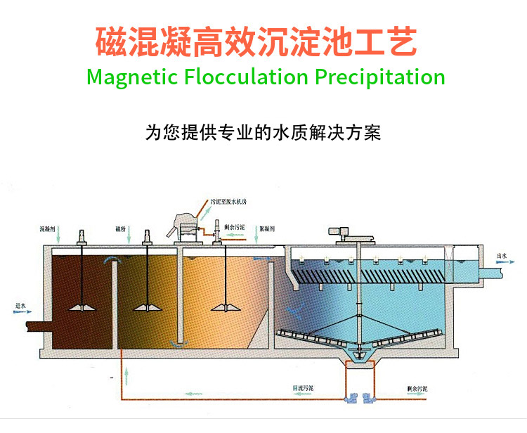 其原理是向原水中投加適量混凝劑、磁種、助凝劑等,使污染物快速絮凝,同時磁種大幅提高絮 體的質(zhì)量,加快了絮體沉降速度,提高了沉淀池的表面負荷,縮短了水力停留時間,提高了處理效率 及出水水質(zhì)標準。其出水效果良好,對于SS、TP、COD、BOD等都有較好的去除效果。